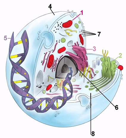 A imagem abaixo está demonstrando uma célula animal com as seguintes estruturas : membrana plasmática, ribossomos, mitocôndria, complexo golgiense, retículo endoplasmático, hialoplasma, núcleo e DNA.
